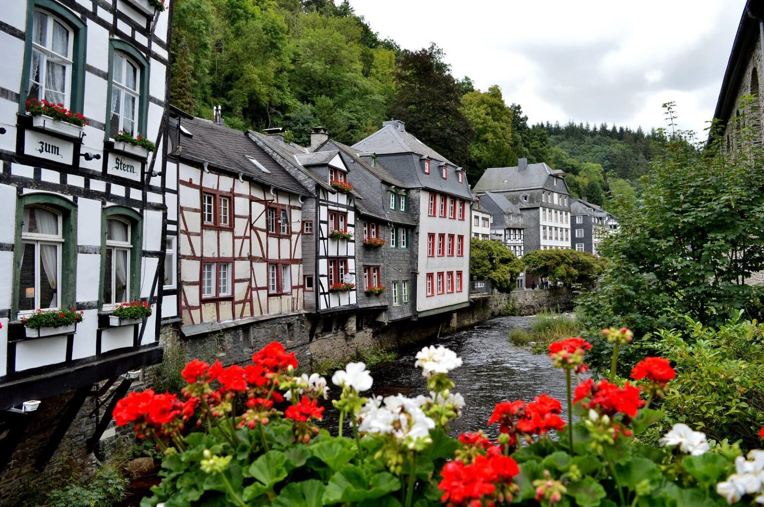 As the sun dips behind the Eifel hills, Monschau’s half-timbered houses begin to shimmer in the fading light. Their white walls and dark beams reflect a warm, golden glow, while flower boxes spill over with color even in the evening shadows. The Rur River, winding gently through the heart of the town, mirrors the streetlamps as they flicker on, casting rippling ribbons of light across the water.